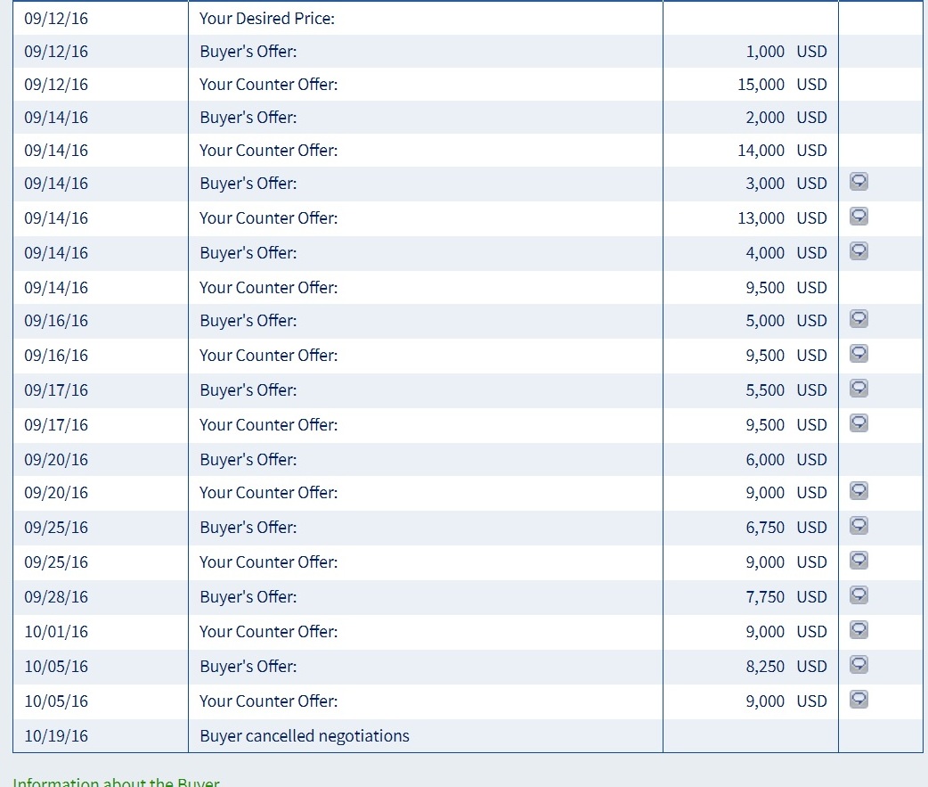 Fast forward to 2016, I received an offer of $1,000 on it through Sedo (buyer from US) when I had listed with Make Offer only. I countered with $15,000. It took more than a week of unsuccessful negotiation whose snapshot I have attached below: